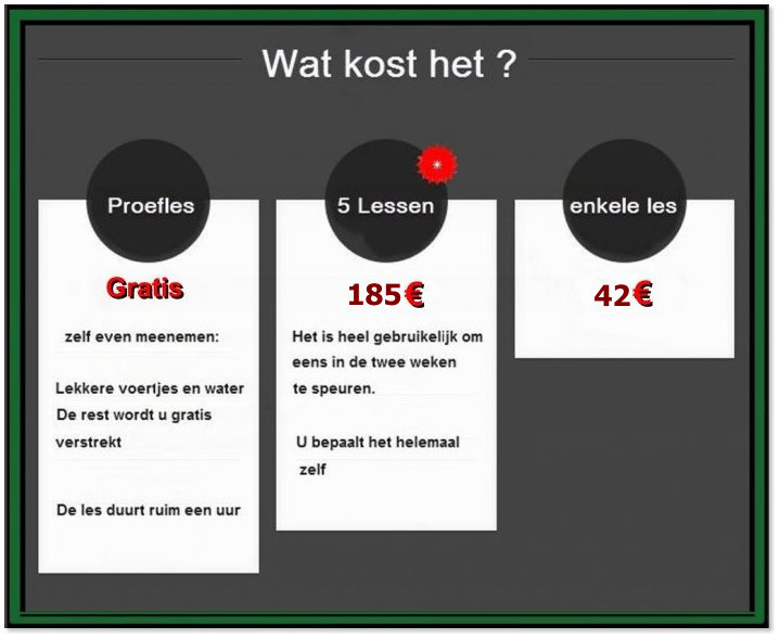 Samen met uw hond leert u zelfstandig een spoor uit te werken naar een vermiste persoon. Hierbij wordt u begeleid door een ervaren instructeur. Aan het einde van de les worden er onder het genot van een kopje koffie of thee de vorderingen besproken.Tijdens de eerste les bent u al in staat een kort spoor uit te werken. Basis (Starten, Veiligheid, Lijnvoering en meer) Niveau 1 (2000m onverhard) Niveau 2 (1000m verhard) Niveau 3 (3000m verhard en onverhard)Wat krijgt u er voor ?